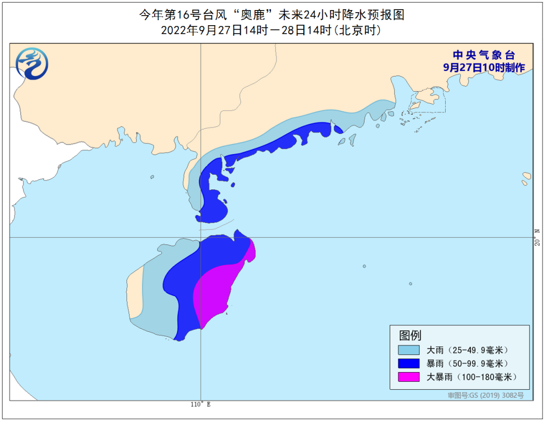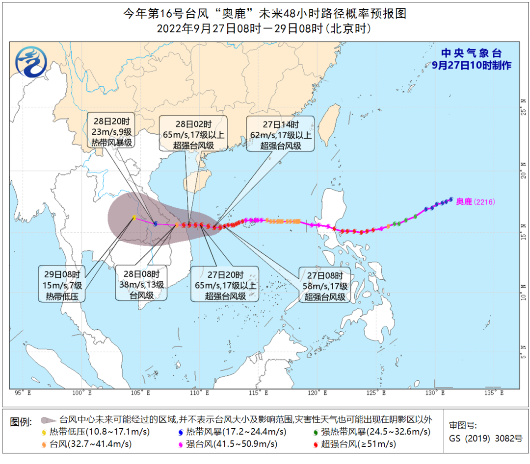 预计,“奥鹿”将以每小时20公里左右的速度向偏西方向移动,强度还将有所增强,掠过西沙群岛南部海域后,将于28日早晨在越南中部沿海登陆(50-55米/秒,15-16级,强台风级或超强台风级),登陆后强度逐渐减弱。