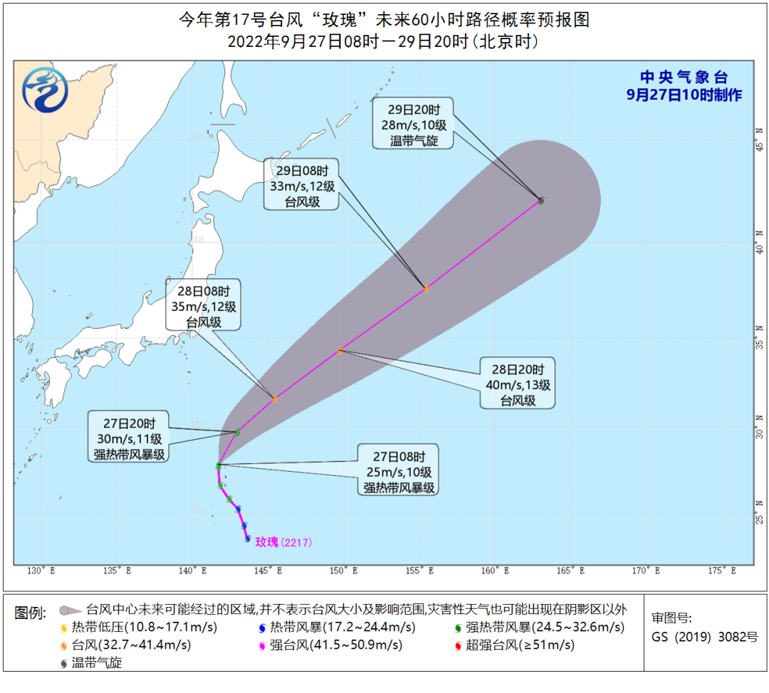 今年第17号台风“玫瑰”(强热带风暴级)的中心今天(27日)上午8点钟位于日本东京南偏东方向大约900公里的西北太平洋洋面上,就是北纬27.8度、东经141.7度,中心附近 风力有10级(25米/秒),中心 气压为985百帕,七级风圈半径150-200公里。
