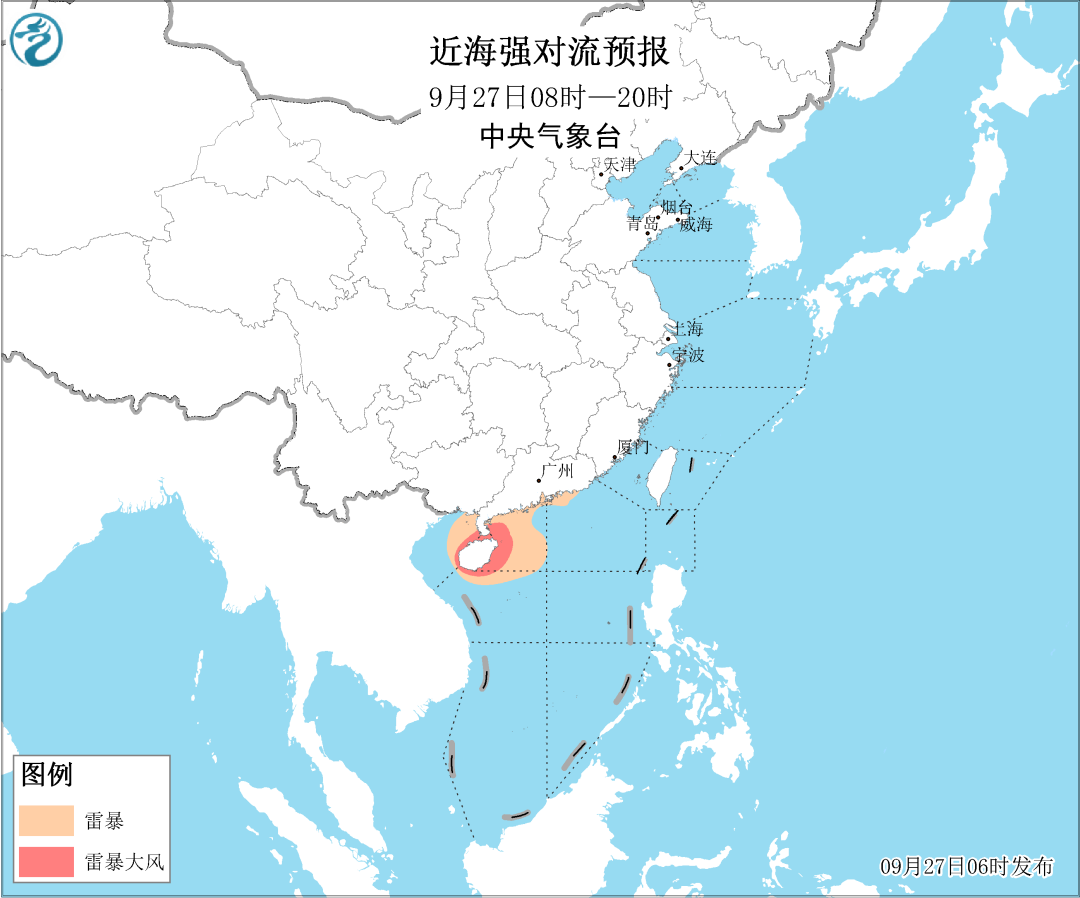 27日白天至夜间,南海西北部海域、琼州海峡、海南沿岸海域、雷州半岛沿岸海域将有8~10级的雷暴大风。