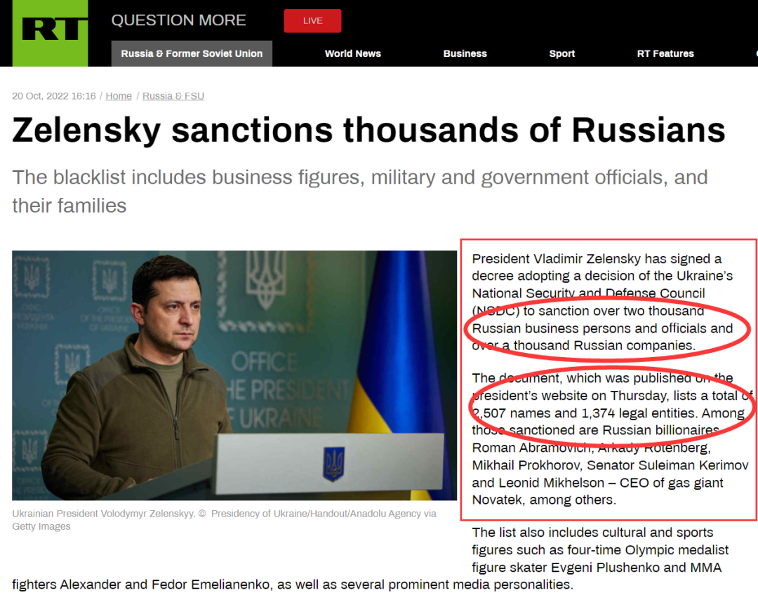 据今日俄罗斯电视台(RT)网站 20 日报道,乌克兰总统泽连斯基签署法令,下令实施乌国家安全和国防委员会的一项决定,制裁 2507 名个人和 1374 个实体。RT指出,被列入制裁名单的有 2000 多名俄罗斯商人和官员,以及 1000 多家俄罗斯公司。