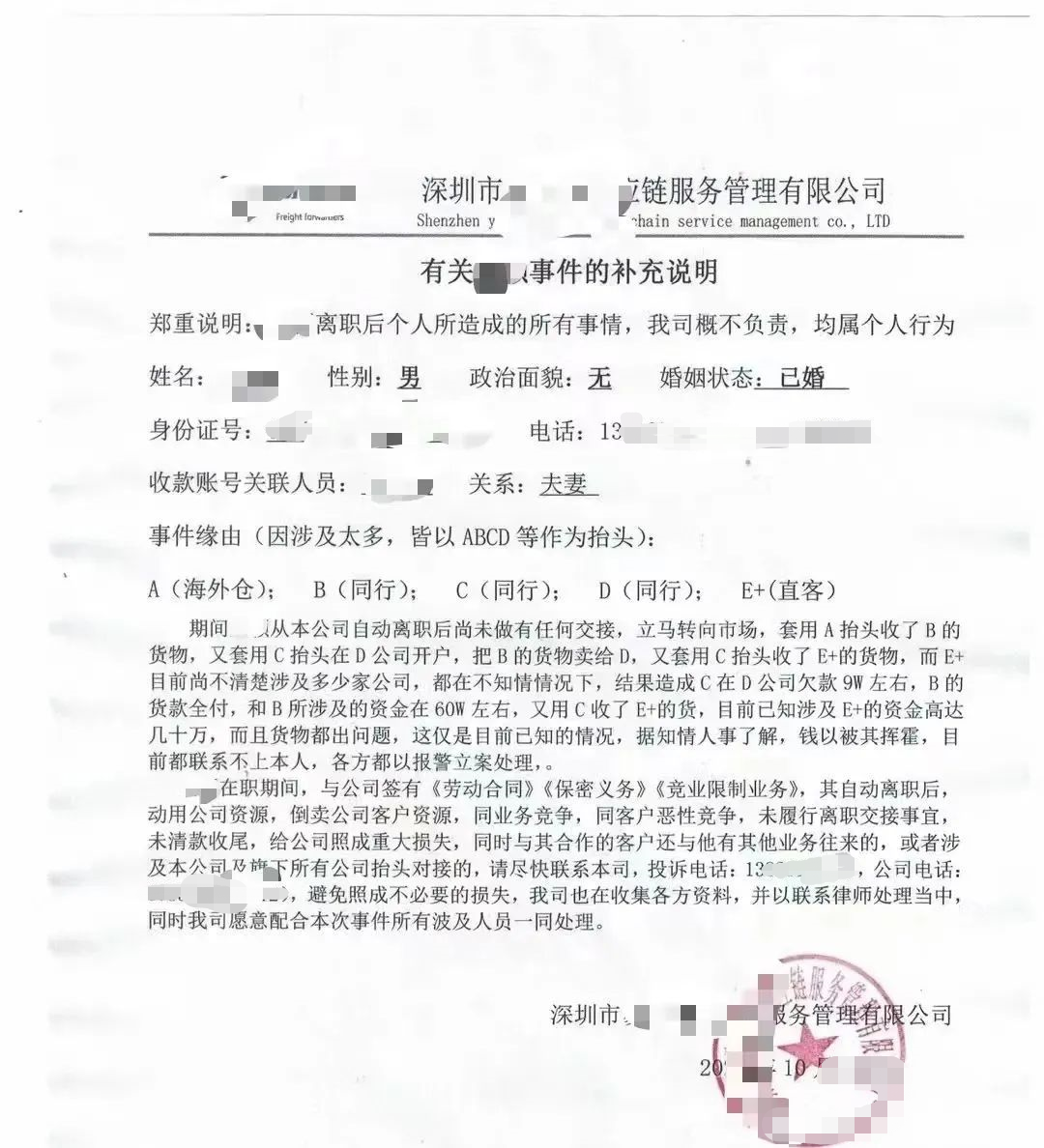 涉事的深圳易XX供应链在这份说明中特别指出:盛某在职期间,与公司签有《劳动合同》《保密义务》《竞业限制业务》,其自动离职后,动用公司资源,倒卖公司客户资源,同业务竞争,同客户恶性竞争,未履行离职交接事宜。未清款收尾,给公司造成重大损失。