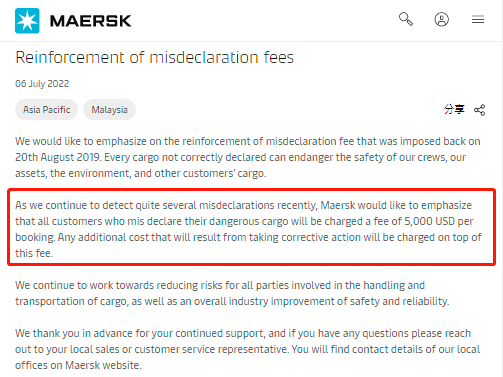 日前,中远海运集运发布《关于正确申报货物信息的告客户书》,告知托运人,不得瞒报、谎报、误报、漏报所申报货物的品名和危险性质级别。尤其关于锂电池货物,并重申无论以何种方式、是否归属于危险货物(根据国际海事危规),只要货物中含有锂电池,均须履行托运职责如实申报。