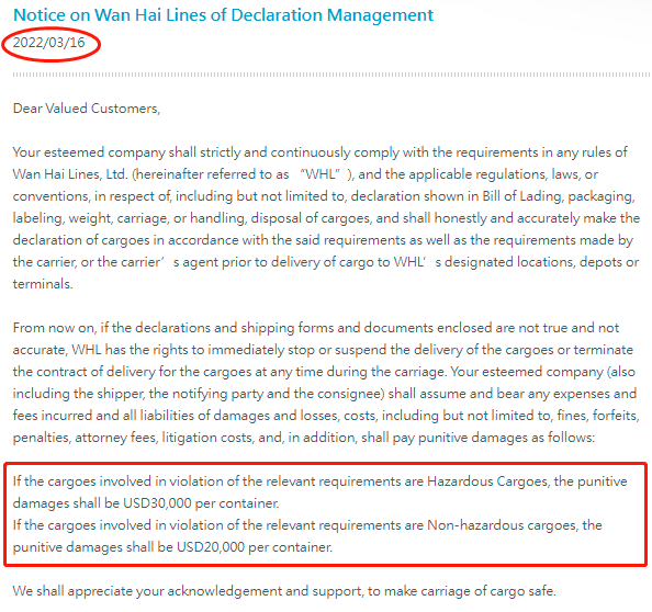 万海航运此前发布公告称,客户应严格遵守万海航运(WHL)的任何规则以及适用的法律、法规或公约的要求,包括但不限于提单上的声明、包装、标签、重量、运输或货物的处理、处置,并应在将货物交付至WHL指定地点、仓库或码头之前,按照上述要求以及承运人或承运代理人的要求,如实、准确地申报货物。