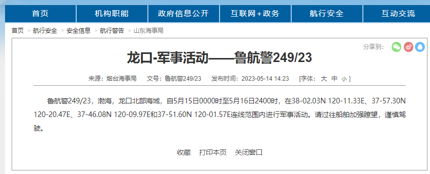 鲁航警249/23,渤海,龙口北部海域,自5月15日0000时至5月16日2400时,在38-02.03N 120-11.33E、37-57.30N 120-20.47E、37-46.08N 120-09.97E和37-51.60N 120-01.57E连线范围内进行军事活动。
