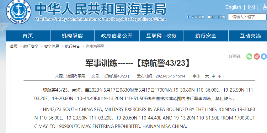 琼航警43/23,南海,自2023年5月17日0830时至5月19日1700时在19-30.80N 110-56.00E、19-23.50N 111-03.20E、19-20.60N 110-44.40E和19-13.20N 110-51.50E诸点连线水域范围内进行军事训练,禁止驶入。