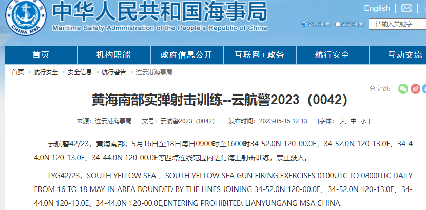 云航警42/23,黄海南部,5月16日至18日每日0900时至1600时在34-52.0N 120-00.0E、34-52.0N 120-13.0E、34-44.0N 120-13.0E、