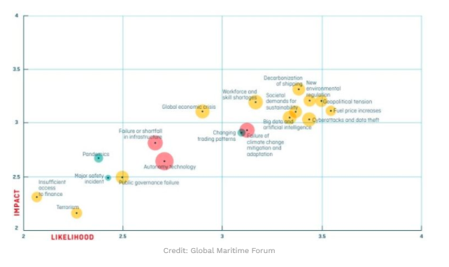 与脱碳和气候变化相关的问题——航运脱碳、新的环境监管、气候变化减缓——在影响和可能性方面继续得到很高的评价,业界对这些问题的准备程度 次提高。