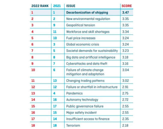 新环境法规和航运脱碳分别从2021年的 和第二位下降到第三和第五位。许多观察家表示担心,俄罗斯和乌克兰之间的冲突对能源使用产生了巨大影响,正在将注意力从气候问题上转移开。