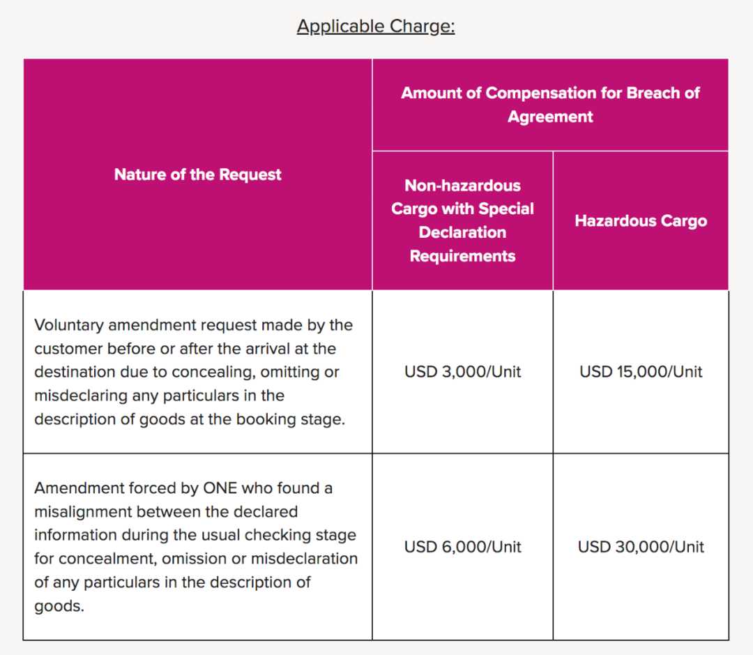 针对在预定阶段瞒报、漏报或错报品名,但货物到目的港前后,再主动申报并要求更改品名的情况:有特殊申报要求的非危险品,费用标准为3000美元/箱,危险品货物的费用标准为15000美元/箱。