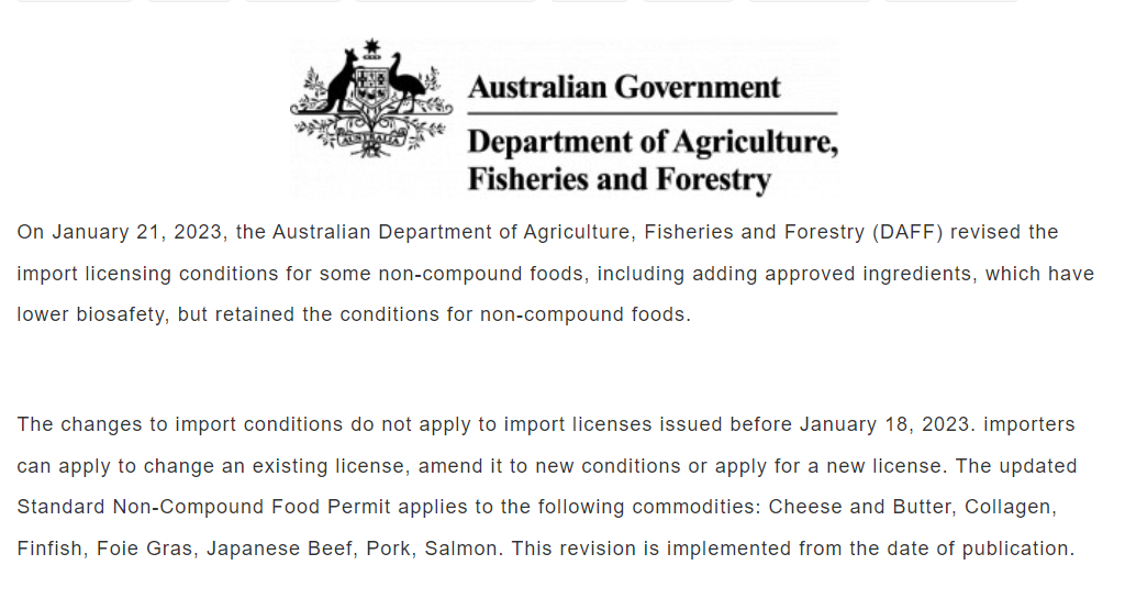 2023 年 1 月 21 日,澳大利亚农业、渔业和林业部修订部分非复合食品的进口许可条件,包括添加经批准的成分,这些成分的生物安全性较低,但保留了非复合食品的条件。