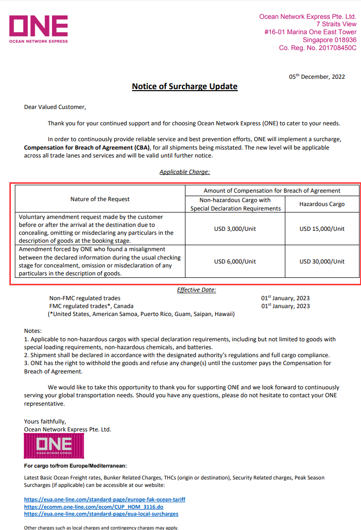 由于不断发现危险品瞒报误报,各大船公司纷纷发布公告重申加强货物瞒报/漏报/误报管理等,将对危险品瞒报者处以重罚。 有船公司罚30000USD/箱!具体情况详询相关船公司。