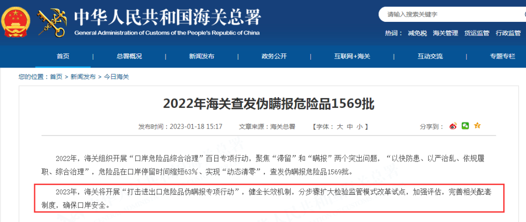 据海关总署网站,2022年海关查发伪瞒报危险品1569批。2023年,海关将开展“打击进出口危险品伪瞒报专项行动”,健全长效机制,分步骤扩大检验监管模式改革试点,加强评估,完善相关配套制度,确保口岸安全。