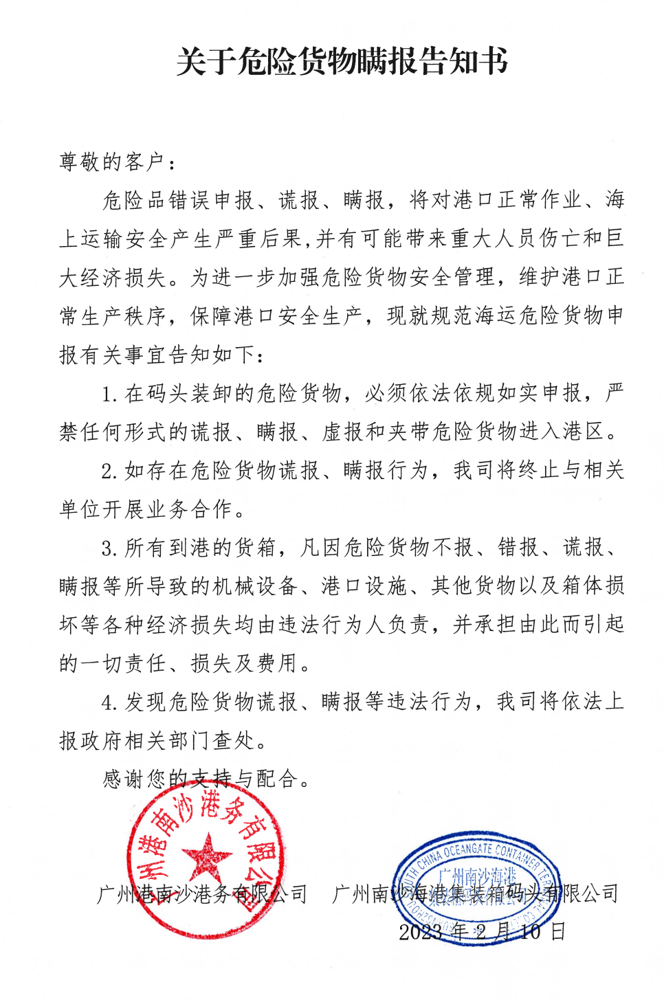 --发现危险货物谎报、瞒报等违法行为,我司将依法上报政府相关部门查处。”