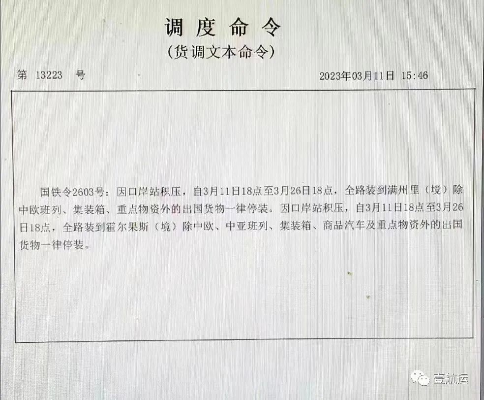 因口岸站积压,自3月11日18点至3月26日18点,全路装到满州里(境)除中欧班列、集装箱、重点物资外的出国货物一律停装。