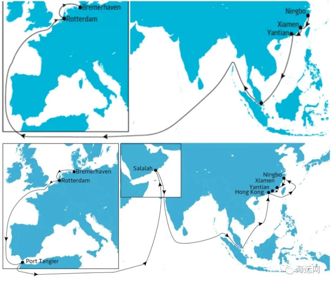 Alphaliner的报告表示,AE1/Shogun环线部署了12艘13,000至20,50TEU不等的船只,运输周期为十一周,挂靠港顺序为:宁波-厦门-盐田-丹戎帕拉帕斯-鹿特丹-不来梅哈芬-鹿特丹-丹吉尔-塞拉莱-香港-宁波。Alphaliner称,现在这条航线将 停止运营。