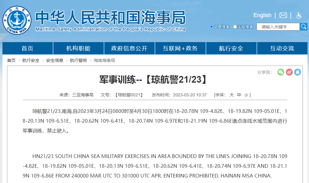 琼航警21/23,南海,自2023年3月24日0800时至4月30日1800时