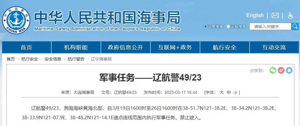 辽航警49/23,渤海海峡黄海北部,自3月19日1600时至26日1600时
