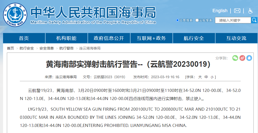 云航警19/23,黄海南部,3月20日0900时至1600时和3月21日0900时至1100时