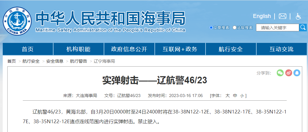 黄海南部实弹射击航行警告