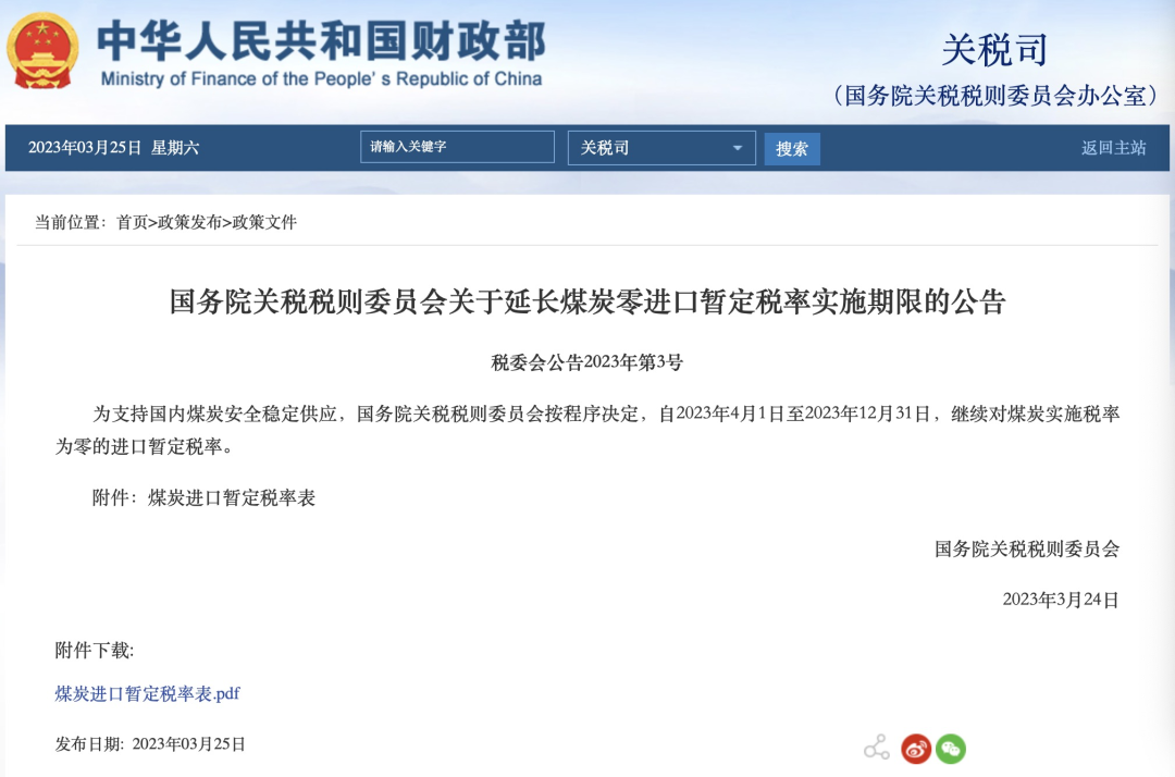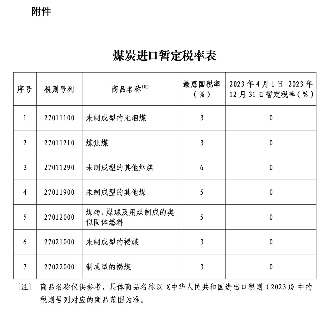 为支持国内煤炭安全稳定供应,国务院关税税则委员会按程序决定,自2023年4月1日至2023年12月31日,继续对煤炭实施税率为零的进口暂定税率。
