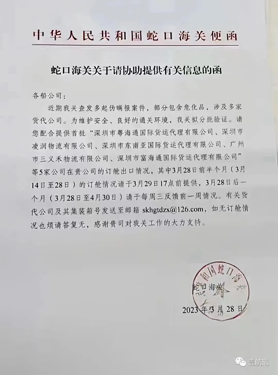 据壹航运 获悉:为进一步加大对危化品伪报瞒报的打击力度,3月28日,深圳蛇口海关向各大集装箱班轮公司发出紧急协助函,5家货代企业罕见地出现在海关通知中!