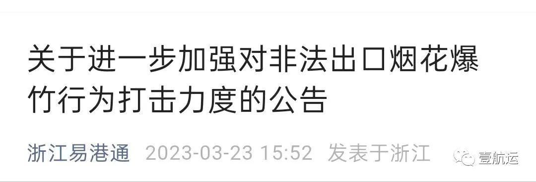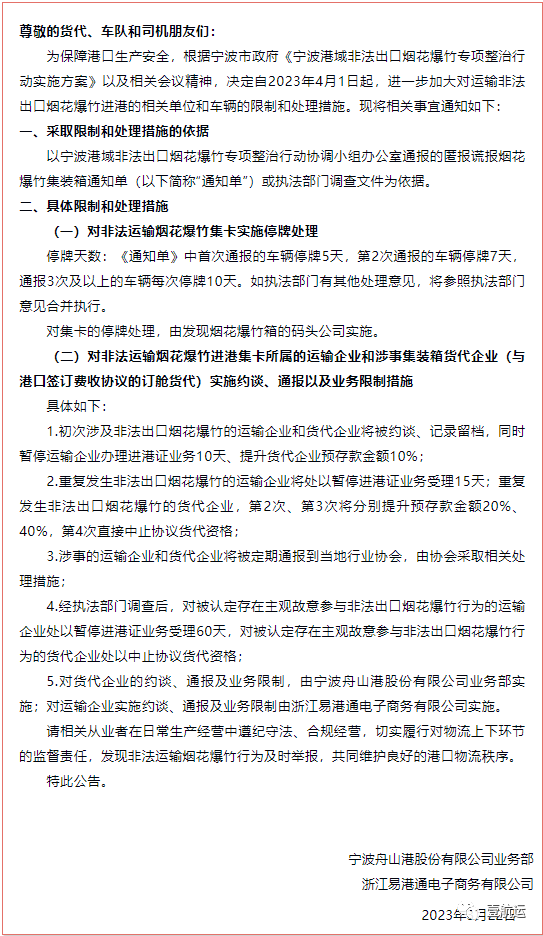 上周三(3月22日),宁波舟山港发布《关于进一步加强对非法出口烟花爆竹行为打击力度的公告》,表示自2023年4月1日起,进一步加大对运输非法出口烟花爆竹进港的相关单位和车辆的限制和处理措施。
