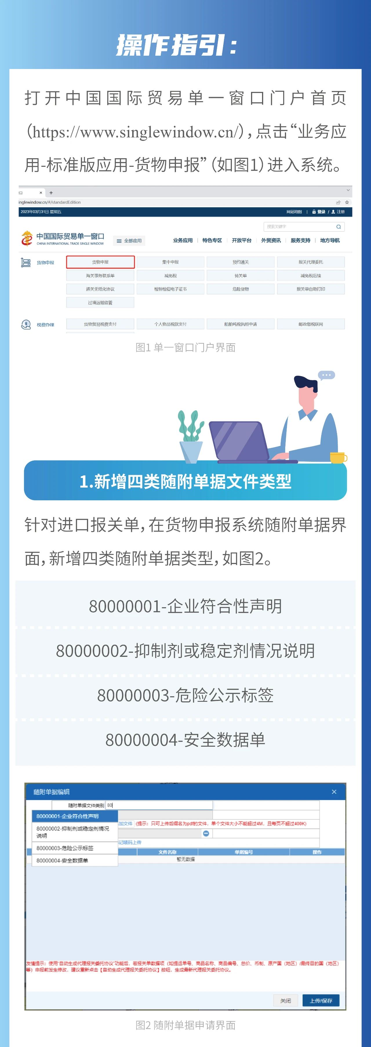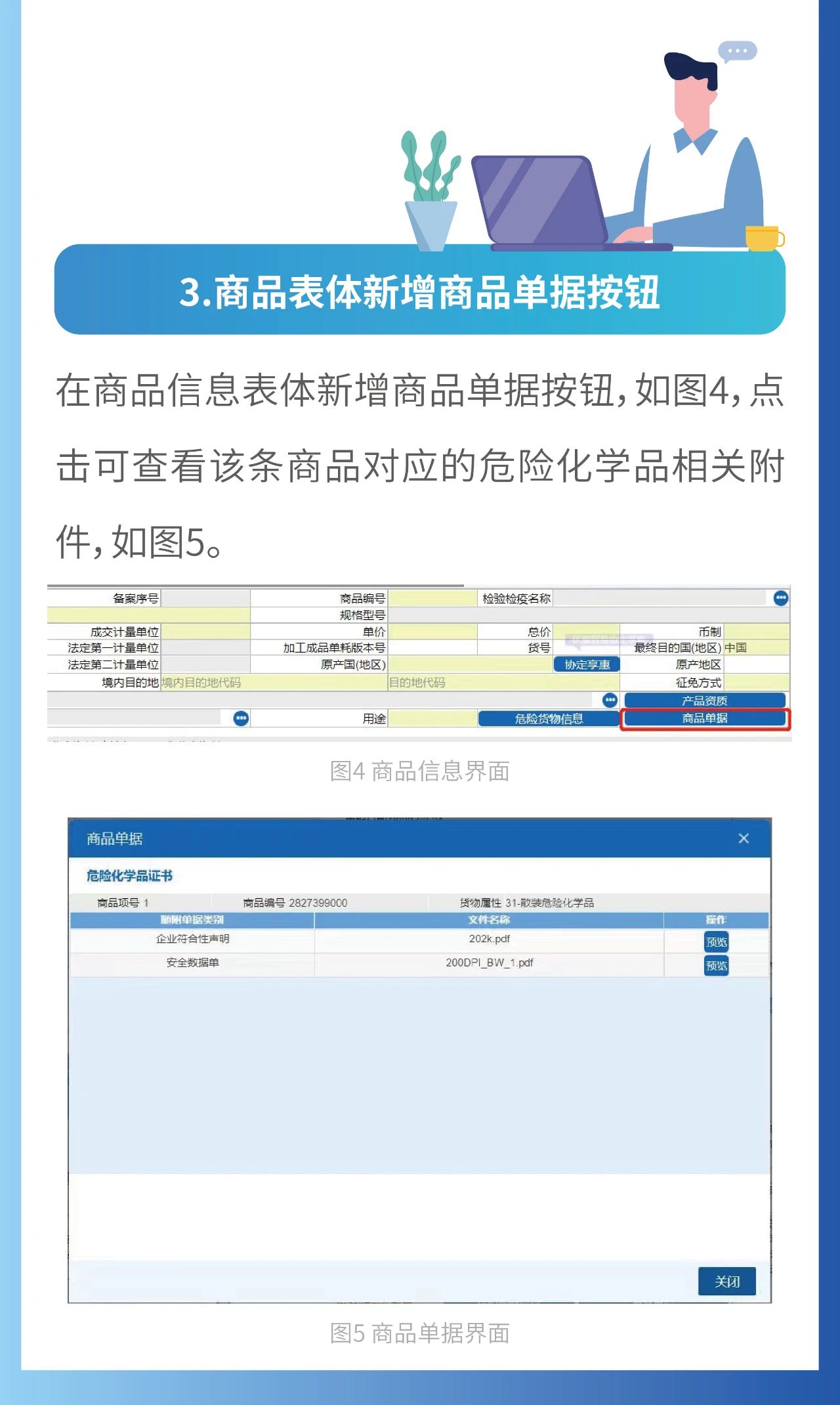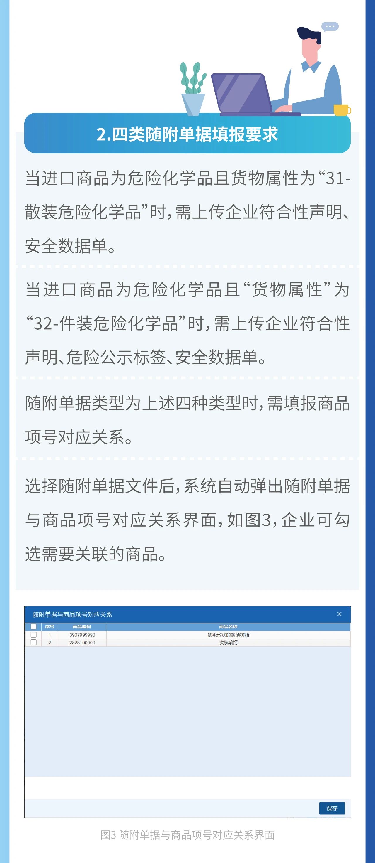 进口危险化学品的收货人或者代理人报关时,应在“中国国际贸易单一窗口”如实填报货物属性、检验检疫名称、危险类别、包装类别、联合国危险货物编号(UN编号)、危险货物包装标记(包装UN标记)和目的地检验检疫机关等,并按照申报货物项分别上传海关总署公告2020年第129号(关于进出口危险化学品及其包装检验监管有关问题的公告)要求提交的相关材料。