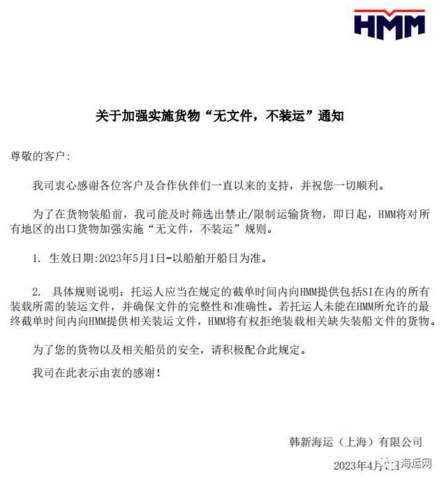 HMM日前发布通知称,为了在货物装船前,HMM能及时筛选出禁止/限制运输货物,即日起,将对所有地区的出口货物加强实施“无文件,不装运”规则。