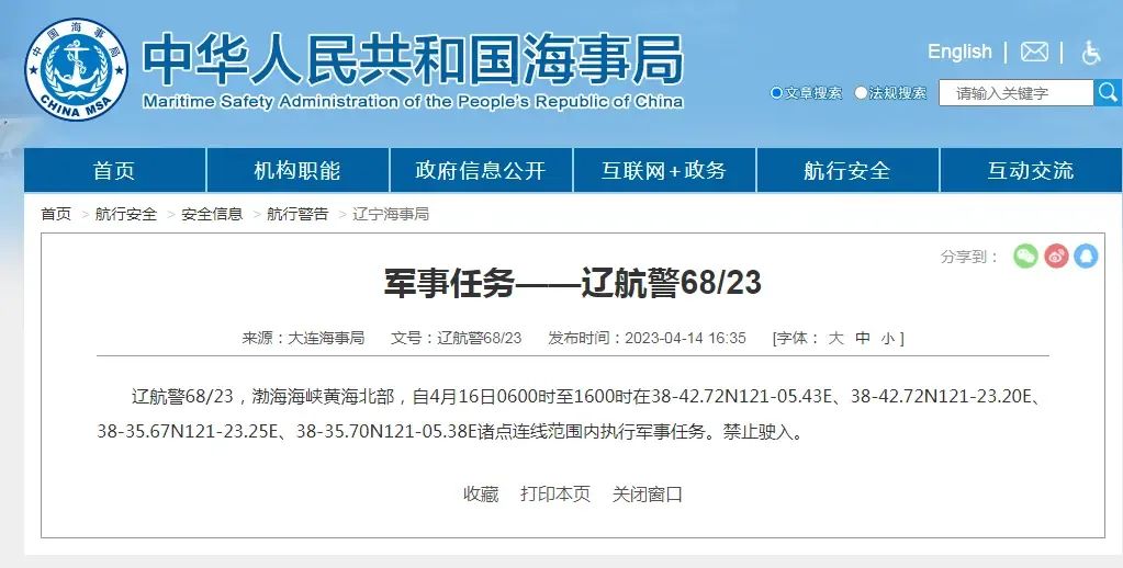 辽航警68/23,渤海海峡黄海北部,自4月16日0600时至1600时在38-42.72N121-05.43E、38-42.72N121-23.20E、38-35.67N121-23.25E、38-35.70N121-05.38E诸点连线范围内执行军事任务。禁止驶入。