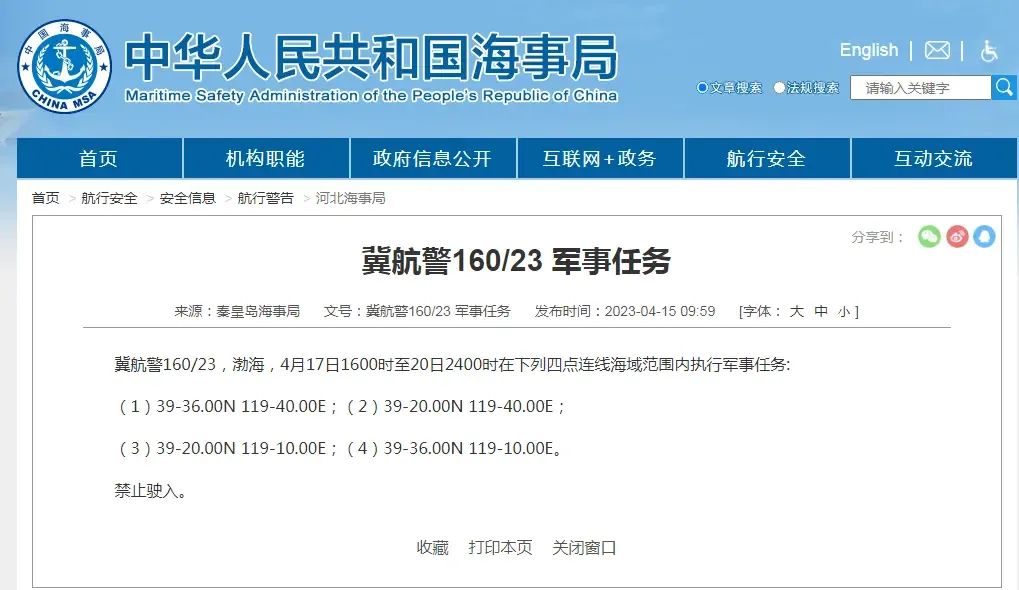 冀航警160/23,渤海,4月17日1600时至20日2400时在下列四点连线海域范围内执行军事任务:
