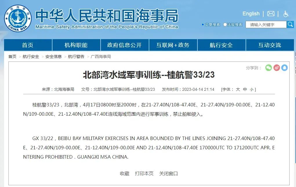 北部湾水域军事训练--桂航警33/23