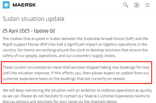 鉴于当前情况将暂时停止接受新的舱位预订,直至情况好转。马士基将继续观测局势,以尽快稳定运营。此前该公司还关闭了在喀土穆和苏丹港的办事处。
