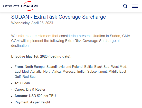 26日,达飞发布通知称,考虑到苏丹的现状,CMA CGM将在目的地实施额外风险附加费,2023年5月1日生效(装船日期)。