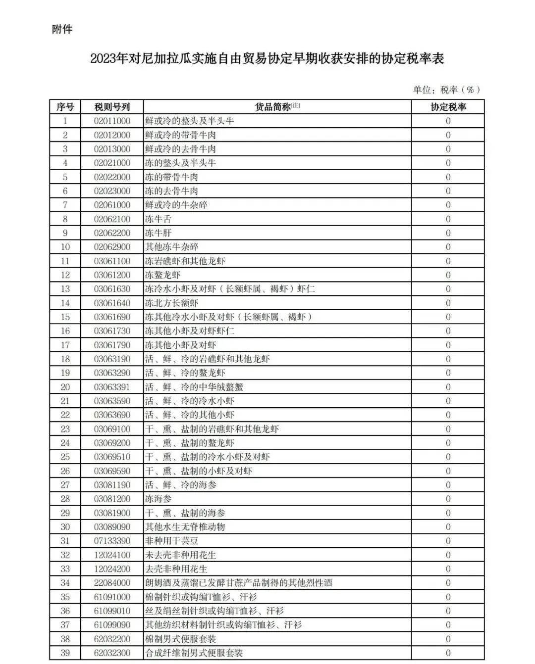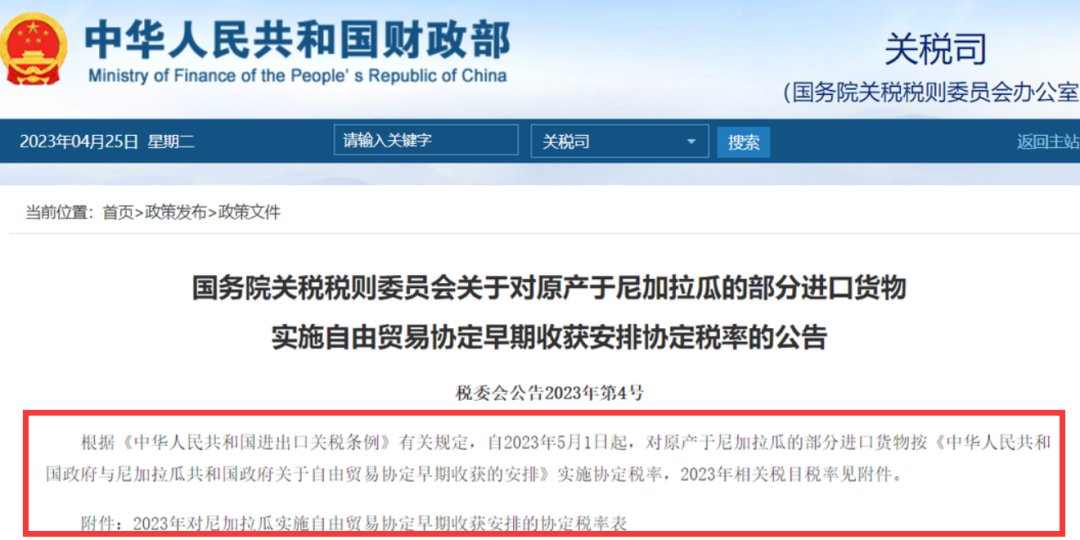 公告称,根据《中华人民共和国进出口关税条例》有关规定,自2023年5月1日起,对原产于尼加拉瓜的部分进口货物按《中华人民共和国政府与尼加拉瓜共和国政府关于自由贸易协定早期收获的安排》实施协定税率,2023年相关税目税率见附件。