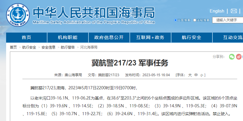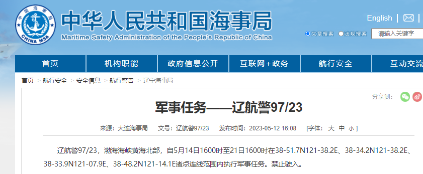 辽航警97/23,渤海海峡黄海北部,自5月14日1600时至21日1600时在38-51.7N121-38.2E、38-34.2N121-38.2E、38-33.9N121-07.9E、38-48.2N121-14.1E诸点连线范围内执行军事任务。禁止驶入。