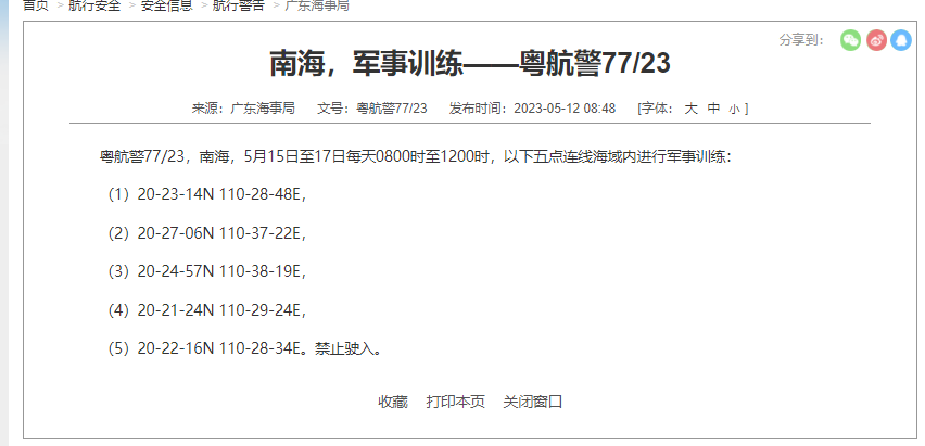 粤航警77/23,南海,5月15日至17日每天0800时至1200时,以下五点连线海域内进行军事训练: