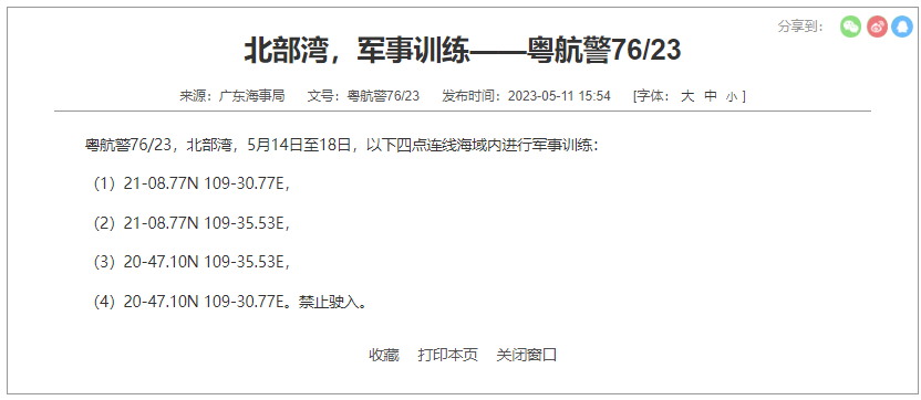 粤航警76/23,北部湾,5月14日至18日,以下四点连线海域内进行军事训练: