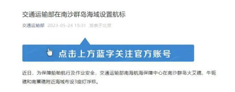 交通运输部5月24日发布消息称,近日,为保障船舶航行及作业安全,交通运输部南海航海保障中心在南沙群岛火艾礁、牛轭礁和南薰礁附近海域布设3座灯浮标。