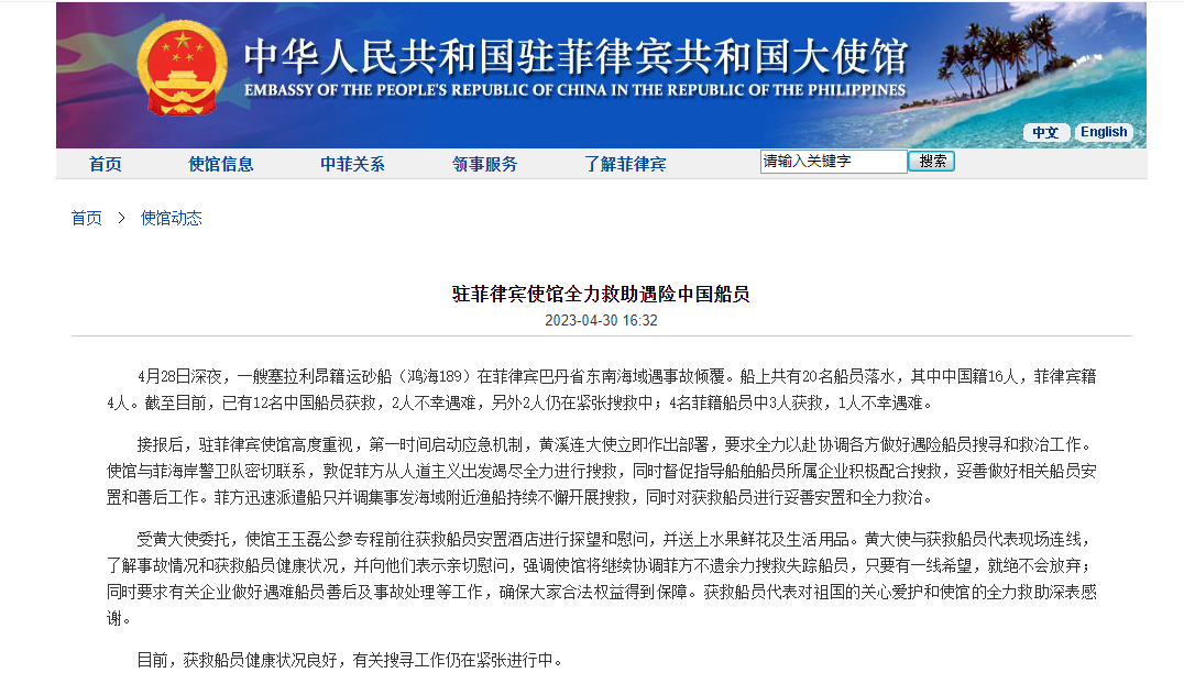 据中国驻菲律宾大使馆网站昨日下午消息,4月28日深夜,一艘塞拉利昂籍运砂船(鸿海189)在菲律宾巴丹省东南海域遇事故倾覆。船上共有20名船员落水,其中中国籍16人,菲律宾籍4人。截至目前,已有12名中国船员获救,2人不幸遇难,另外2人仍在紧张搜救中;4名菲籍船员中3人获救,1人不幸遇难。