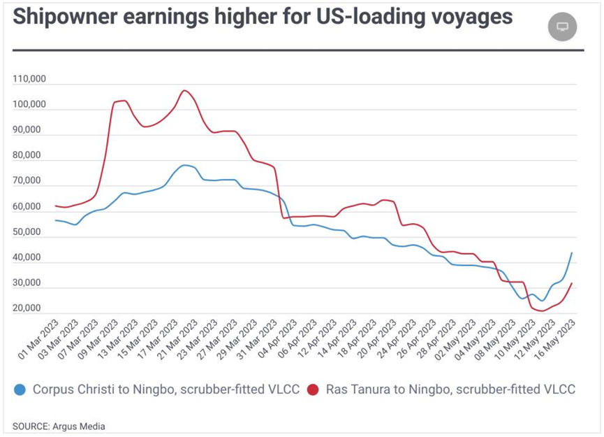 《劳氏日报》报道,国际能源报价机构Argus Media在其 报告中指出,在经历了自3月以来的大幅下跌后,亚洲炼油商在其他地区减产之际转向美国,VLCC的租金再次走高。 数据显示,自5月10日以来,从美国港口出发的VLCC租金已经上涨了35%。