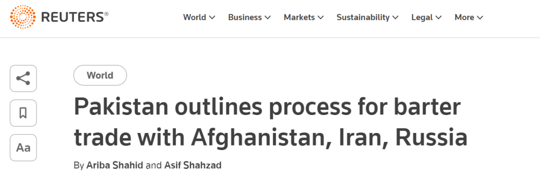 近日,据路透社报道,巴基斯坦公布了与阿富汗、伊朗、俄罗斯的易货贸易流程。