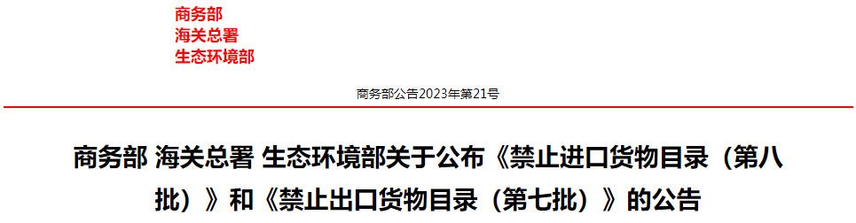 2023年6月6日,商务部、海关总署、生态环境部公布《禁止进口货物目录(第八批)》和《禁止出口货物目录(第七批)》的公告。根据《对外贸易法》,国家基于国家安全、社会公共利益或者公共道德、人民健康或者安全,保护动物、植物的生命或者健康,保护环境等原因,可以限制或者禁止有关货物进口或者出口。
