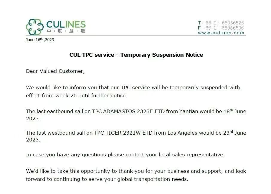 6月16日,中联航运(CU Lines)发布公告,宣布将从第26周(6月25日)起暂停其美西电商快线TPC航线,直至另行通知。