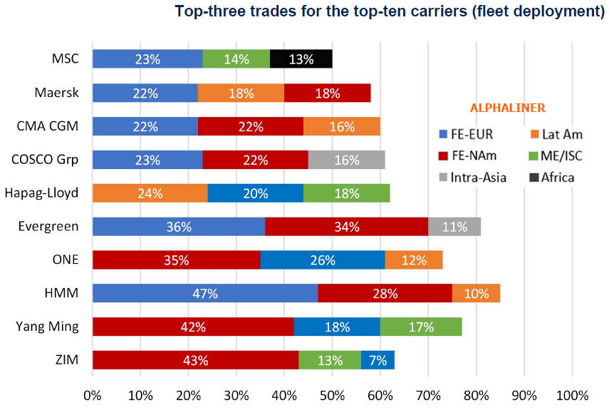以以星航运ZIM为例,该公司虽然目前仍以跨太平洋航线为业务中心,但也在调整一些业务比例。