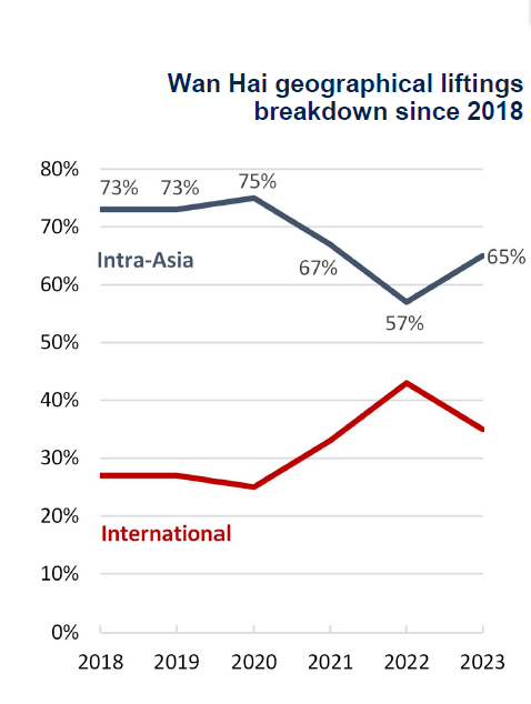 此外,万海航运正在从跨太平洋航线快速撤退。目前,我国台湾地区的这家集运公司在跨太平洋航线上的运力占比已经从2022年 时候的40%降到了28%。