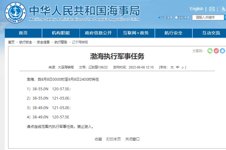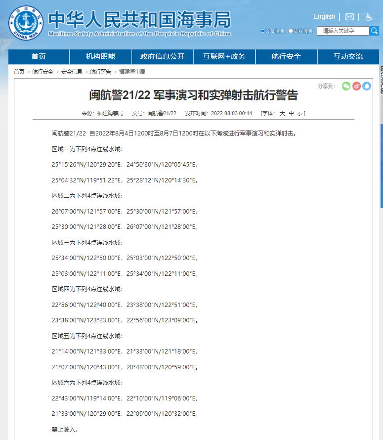 闽航警21/22 自2022年8月4日1200时至8月7日1200时在以下海域进行军事演习和实弹射击。