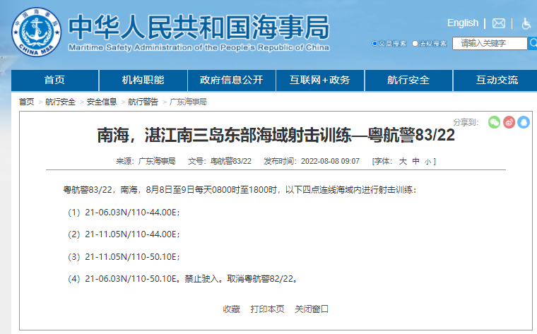 3、南海,湛江南三岛东部海域射击训练—粤航警83/22