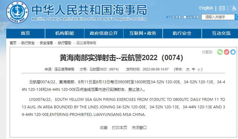 云航警0074/22,黄海南部,8月11日至8月13日每日0900时至1600时在