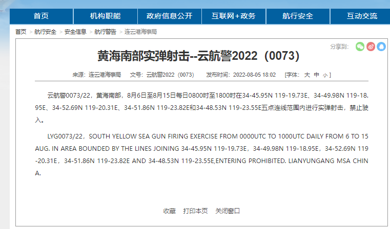 云航警0073/22,黄海南部,8月6日至8月15日每日0800时至1800时在